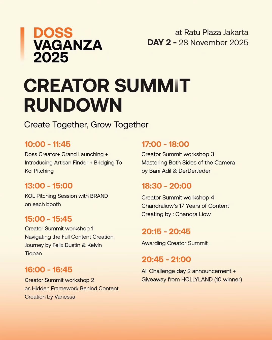 Daftar SekarangHai Sahabat DOSS, jika kamu ingin join event workshop CREATOR SUMMIT ini, kamu bisa langsung DATANG ke ON THE SPOT atau bisa mendaftar Online melalui link dibawah ini yaa!