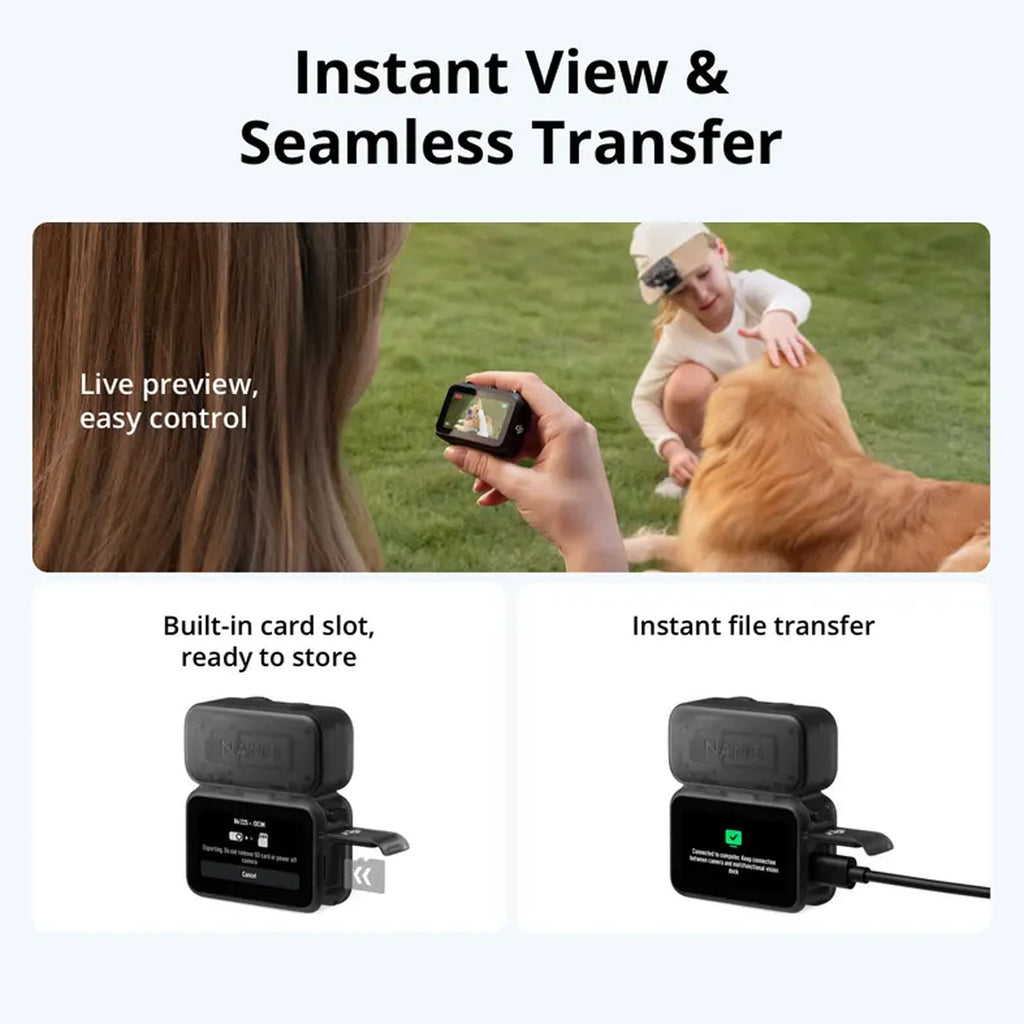 The compact camera body features dual built-in microphones for stereo recording, delivering clear, vivid audio for an immersive first-person audiovisual experience.Optional accessories include the ability to connect two DJI OsmoAudio wireless microphone transmitters for simultaneous use, which can be helpful when recording a two-person interview.