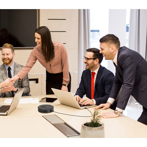 The built-in speaker provides plenty of coverage to ensure that all participant clearly hear the call. You can quickly adjust the volume and mute the mic using the buttons conveniently located on top of the device. A headphone jack enables you to listen to your calls in private with headphones.