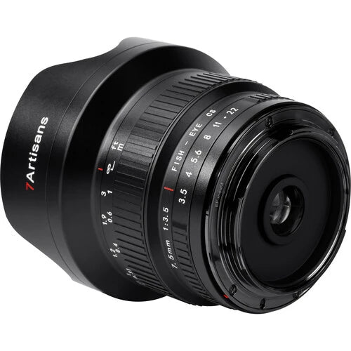 With an expansive 205° angle of view, the Canon EF-mount 7.5mm f/3.5 Fisheye Lens from 7artisans is an all-manual lens capable of producing unique perspectives and creative distortions. The lens's f/3.5 maximum aperture benefits working in a variety of lighting conditions while maintaining a small and lightweight form factor for handheld shooting. Multi-layer coatings have been applied to individual glass elements to suppress flare and ghosting for improved contrast and color fidelity when working in strong lighting conditions. The lens has an all-metal body and features a built-in petal-shaped lens hood to help reduce flare while protecting the front element.