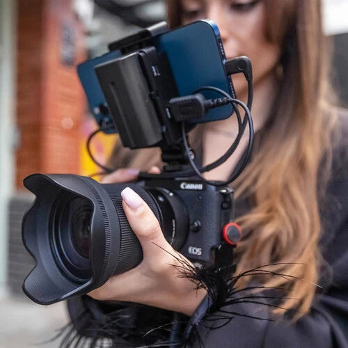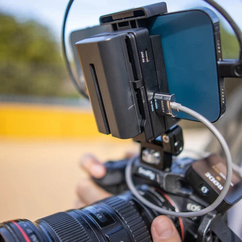 Powered by a widely-available rechargeable Sony NP-F type battery, the battery powers the SeeMo and also maintains the charge on your iPhone. A single NP-F 970 type battery can power the device for up to 8 hours. A 5V/2A USB-C output port on the side of the SeeMo allows for the powering of devices like microphones or small on-camera lights.