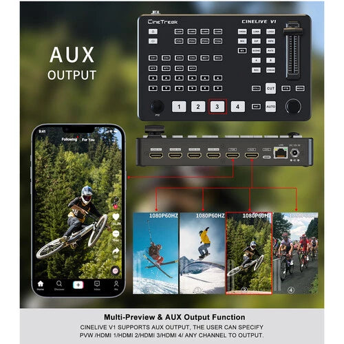 Mix and live stream video in either a standard horizontal or a social media-friendly vertical orientation using the CineLive V1 4-Channel HDMI Video Switcher from CineTreak. This portable switcher supports up to four channels of 1080p60 video with two channels of embedded audio per channel. It provides four HDMI inputs, one LAN port, one USB-C UVC output, two 3.5mm audio inputs, two HDMI program/preview outputs, and USB-A external recording. The CineLive V1 switcher supports up to two simultaneous RTMP streams of 1080p60 video to popular platforms using its USB-C and LAN ports. It features H.264 encoding, luma and chromakeying, 32 transition effects, and VISCA control for up to four PTZ cameras.