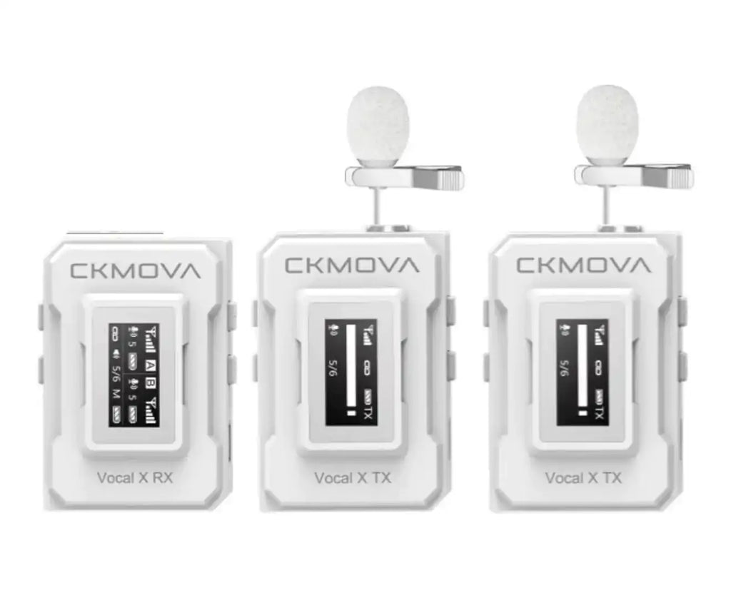 The new CKMOVA Vocal X V2 Compact 2.4GHz Dual-Channel Wireless Microphone in White is composed of two transmitters and one receiver. Features a pairing button for easy use, OLED display, long battery life up to 10 hours, <5ms latency, 100m stable range.