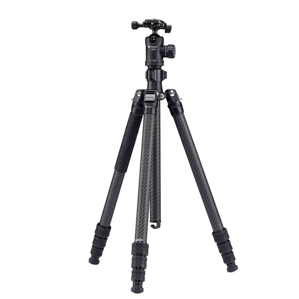 The Sherpa Max Carbon Fiber Travel Tripod with FPH-62QS Arca-Type Ball Head from Fotopro is a lightweight and versatile carbon fiber travel tripod with an Arca-Type compatible ball head. It has a load capacity of 26.5 pounds and a maximum height of 68.9" yet folds down to a compact length for storage or travel. The center column can be removed, and the legs spread out wide for low-perspective shooting from a height of just 9.5". Once removed, the center column can also be combined with the removable leg to form a monopod for moving more quickly, like when shooting action or wildlife.