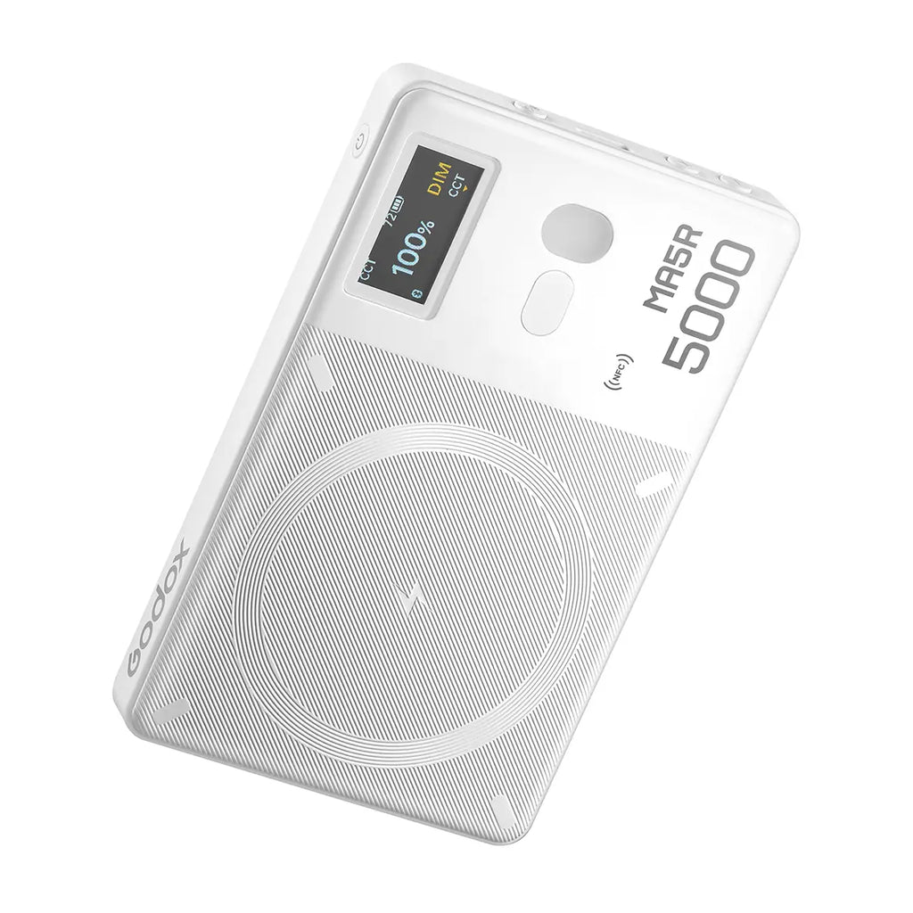 Bright and pocket-sized, the Litemons MA5R RGB LED Light and Power Bank from Godox is a full-color 2.68 x 4.21" panel that charges your phone and creates vibrant lighting effects. Its magnetic wireless power bank offers over 220 minutes of lighting runtime after a 90-minute charge. Ideal for content creators and vloggers, the light includes a selfie mode and 0-100% dimming capabilities to help create more refined lighting. With its RGB color versatility and 14 pre-programmed effects, it's simple to create unique lighting setups. Use the onboard, Bluetooth, and NFC connection options to easily connect the light to your phone and customize your settings in the Godox app.