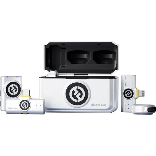 Record up to two people in mobile journalism or content creation applications using this ivory white, 2.4 GHz LARK M2 DUO Wireless Combo Microphone System from Hollyland. The system includes two transmitters with built-in omnidirectional microphones and dual-interface mesh, three different receivers, and a charging case. Magnetic back clips and silicone necklace cases make attaching your transmitters to your talent a breeze. Various adapter cables and an integrated camera shoe mount ensure wide device compatibility.