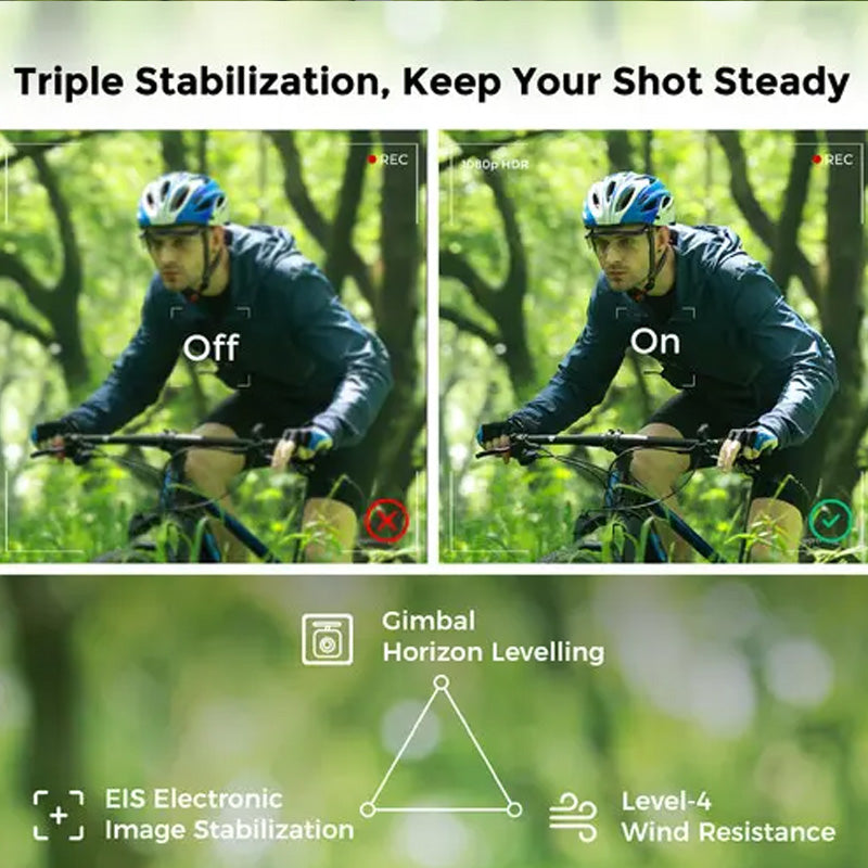 The Hover X1 has been equipped with a triple stabilization system to help it film smooth, shake-free video. The system is comprised of level 4 wind resistance, gimbal horizon leveling, and both mechanical and electronic image stabilization.