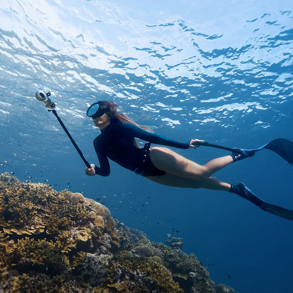 When the X5 is attached to a selfie stick, the stick disappears in your edit, enabling you to capture aerial angles and third-person perspectives that can be achieved without a second operator.