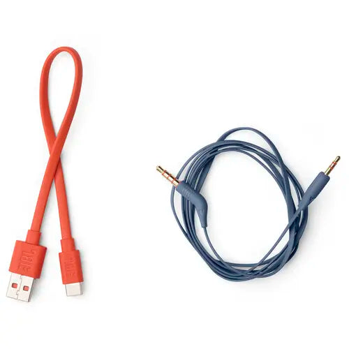 The Tune 770NC includes a USB-C to USB-A charging cable and a 3.5mm audio cable with a right-angle connector for wired battery-saving connections.