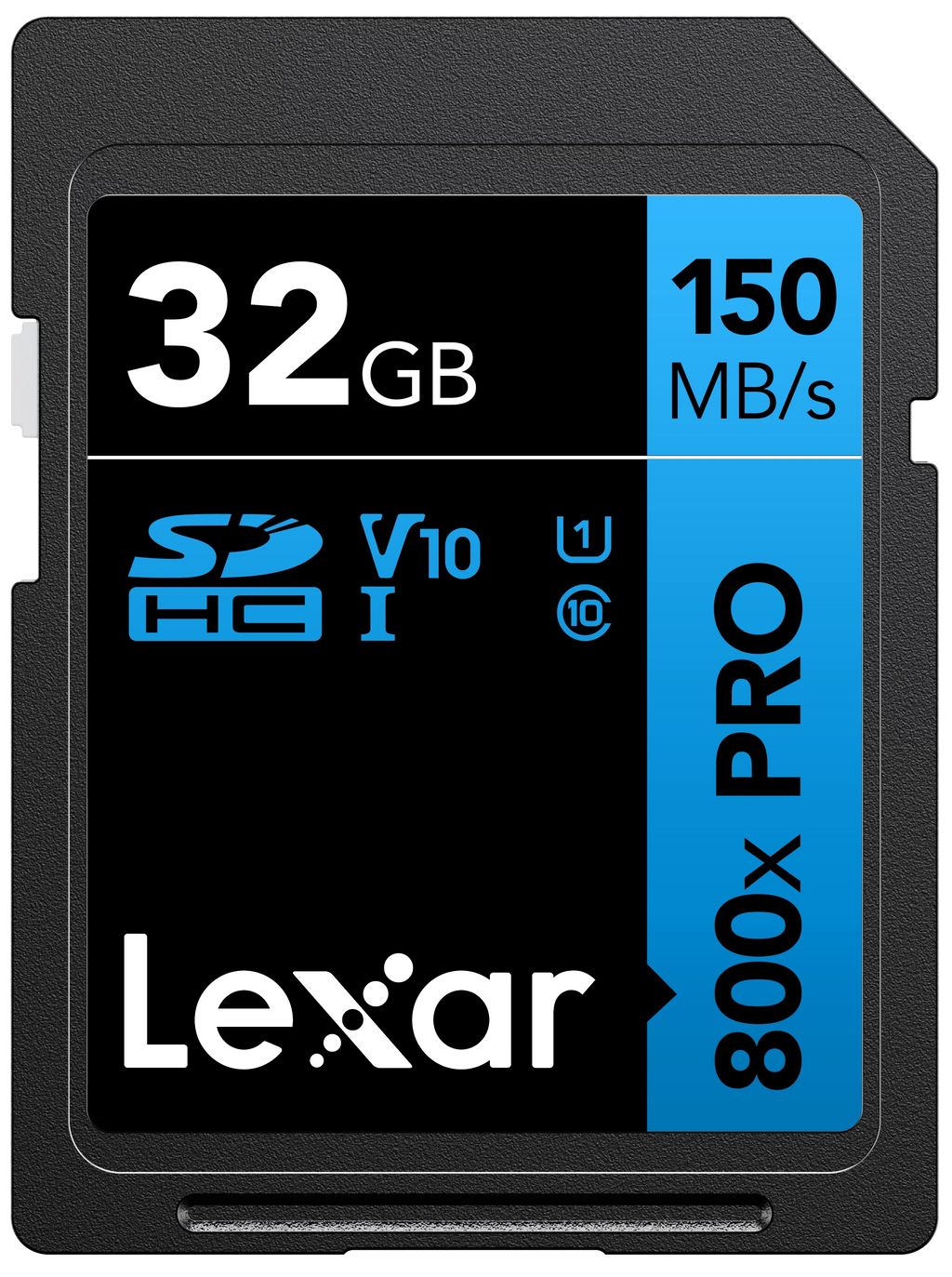 Designed for point-and-shoot cameras, mid-range DSLR cameras, and HD camcorders, the 32GB High-Performance 800x UHS-I SDHC Memory Card (BLUE Series) from Lexar features a storage capacity of 32GB and takes advantage of the UHS-I bus to let you quickly capture and transfer Full HD video, as well as raw and JPEG captures. This card can achieve maximum read speeds of up to 150 MB/s and, thanks to its V10 speed class rating, minimum write speeds are guaranteed not to drop below 10 MB/s.