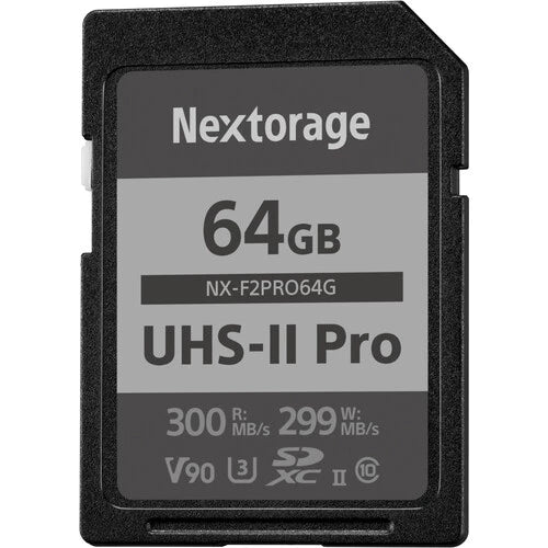Designed for high bit depths, frame rates, and resolutions, including 8K, 4K, and Full HD video, as well as raw and continuous burst photography, the NX-F2PRO Series UHS-II SDXC Memory Card from Nextorage features a storage capacity of 64GB. It takes advantage of the UHS-II bus to support read speeds up to 300 MB/s and write speeds up to 299 MB/s. Thanks to its V90 Video Speed Class rating, minimum write speeds are guaranteed to not drop below 90 MB/s.