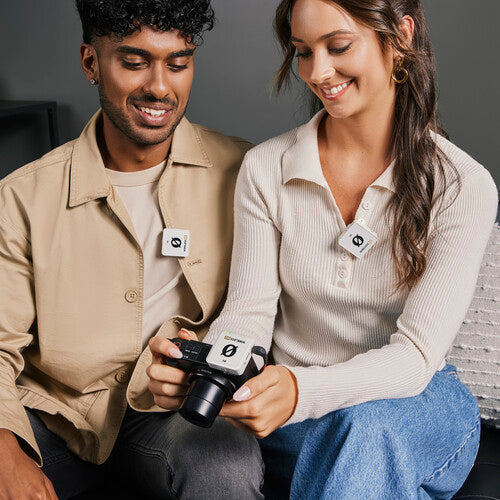 The white Rode Wireless ME is a streamlined and easy-to-use wireless microphone system that lets content creators, vloggers, influencers, and mobile journalists at all experience levels quickly and confidently incorporate hands-free wireless audio into their productions—regardless of whether they're shooting on a camera, tablet, or mobile device. In addition to the two clip-on microphone/transmitters, the two-channel receiver also sports a built-in mic, making it possible to record audio from the camera operator—great for two-person interviews and documentaries.